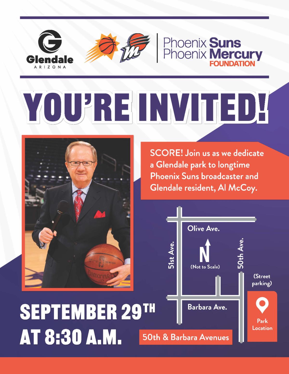 Al McCoy was the unmistakable ‘Voice of the Suns’ and a proud member of the Glendale community. On Monday, September 29, the City of Glendale and the Phoenix Suns and Mercury Foundation will celebrate the man whose voice defined Suns basketball in the city he proudly called home for an incredible 50 years.
