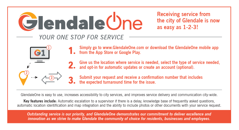 By using GlendaleOne to report this issue, staff will automatically be assigned for follow-up. Submitters also have the option to personalize notification preferences for automatic progress updates, add photos, search a knowledge base of frequently asked questions, quickly access important phone numbers, and request a variety of other city services.