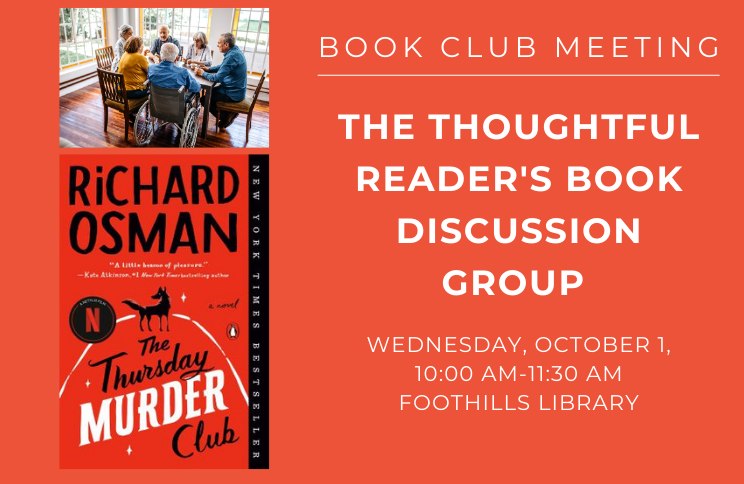 Join us on the first Wednesday of every month to discuss emotionally uplifting and inspirational fiction. This month, we will discuss The Thursday Murder Club by Richard Osman.