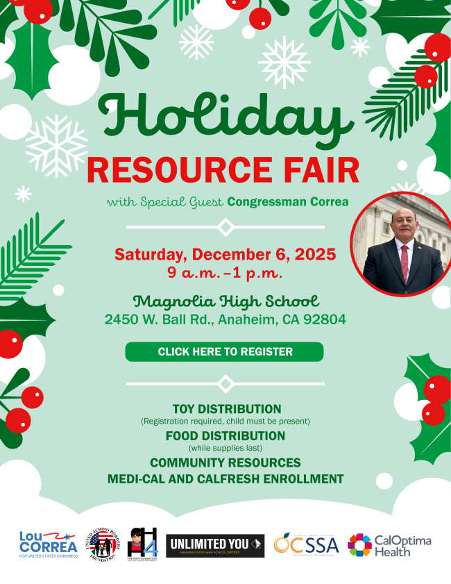 CalOptima Health, in collaboration with AHSD, will host a Holiday Resource Fair and toy distribution event featuring special guest Congressman Lou Correa.