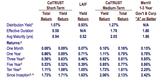 1. CalTRUST Short-Term and Medium-Term and LAIF yields are net of fees. Merrill 1-5 Year Indexes are unmanaged; and do not reflect any deduction for administrative fees or expenses. 2. CalTRUST and LAIF returns are net of all investment advisor, administrative and program fees. 3. Annualized. 4. The CalTRUST Short-Term and Medium-Term portfolios commenced operations on February 13, 2005.