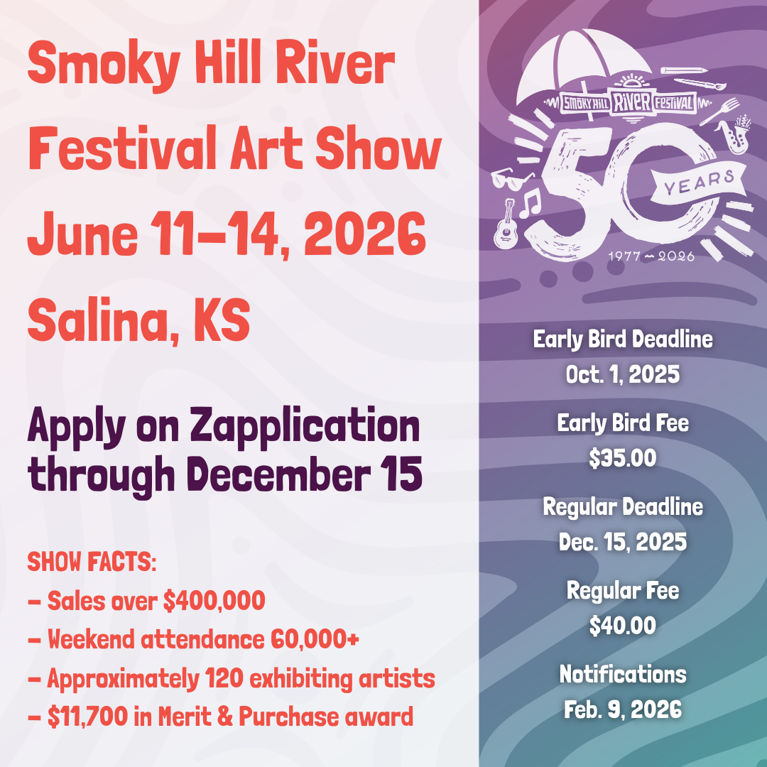 Artists can submit up to three designs, and local artists will receive preference. All artwork must be family-friendly. SAH staff will select up to six designs that reflect the vibrant energy and spirit of the Smoky Hill River Festival.
