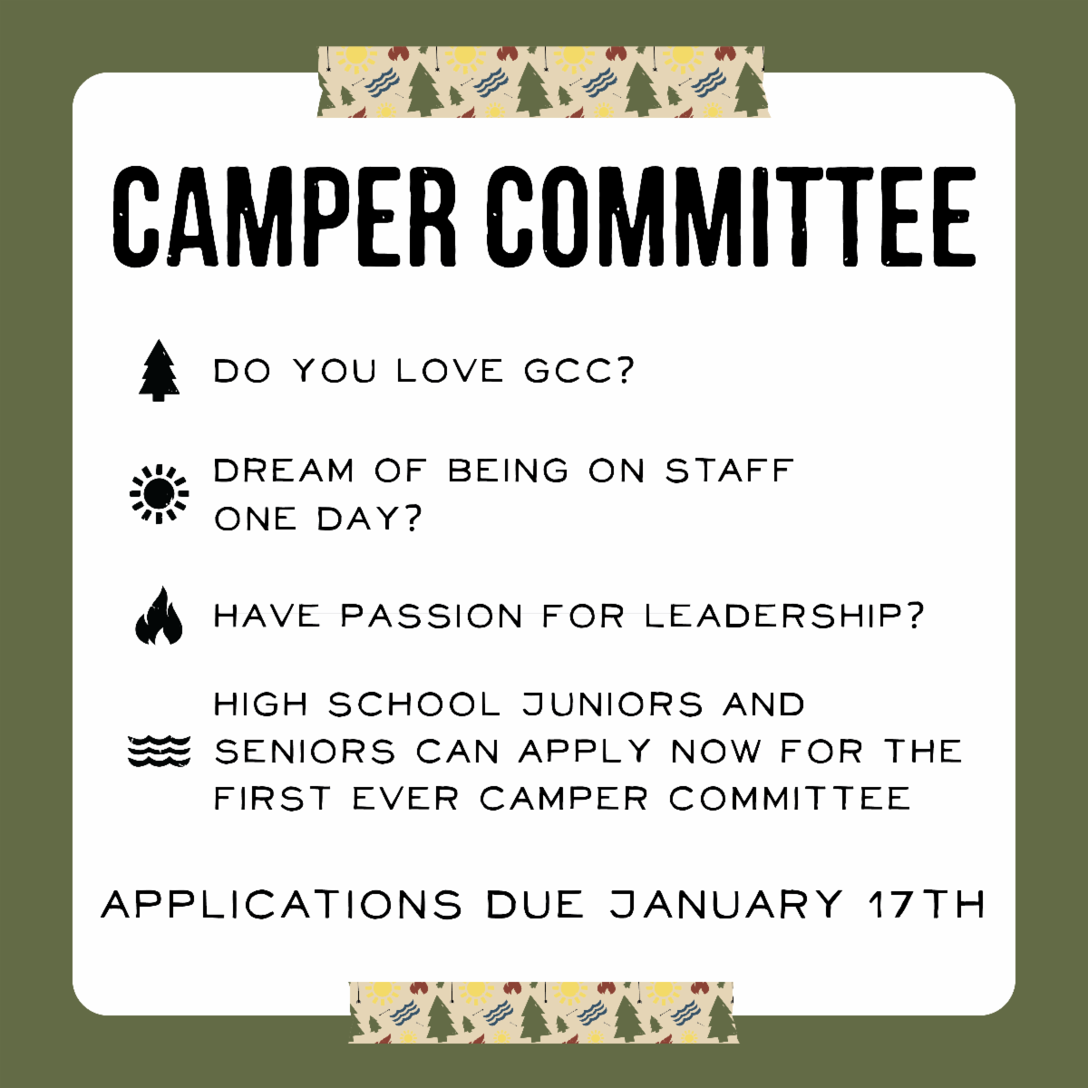 GCC is looking for juniors and seniors in high school to serve on the Camper Committee and represent the collective voice of our campers, so we can continue to provide the best camp experience for everyone.