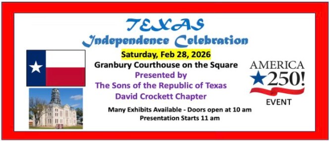 The Texas Independence Celebration is an annual event sponsored by the David Crockett Chapter of the Sons of The Republic of Texas. February 28th beginning at 10AM, enjoy exhibits in the Historic Hood County Courthouse with a presentation at 11 AM.