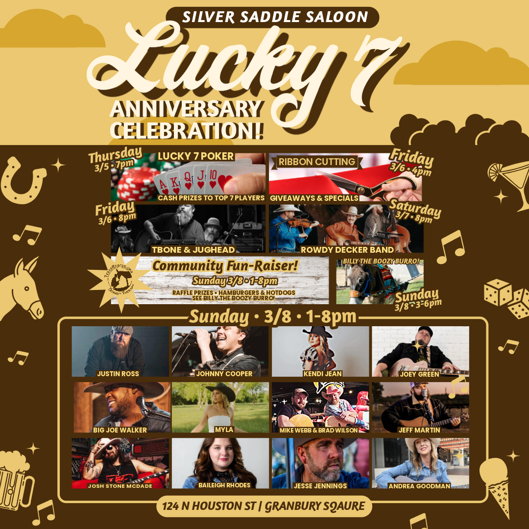 Silver Saddle Saloon is celebrating lucky number 7 years of serving the community and visitors of Granbury March 5th-8th. You can't help but take a peak inside when you catch the scent of waffle cone as you stroll down Houston St on the Historic Granbury Square. Silver Saddle is a beloved family friendly (fur babies too) ice cream parlor, live music venue and saloon.