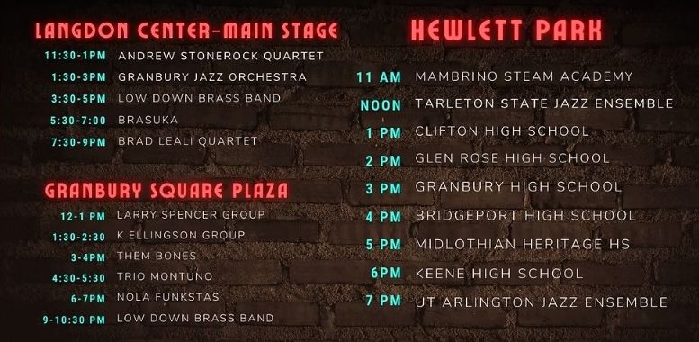 The sounds of jazz return to the heart of Granbury! Enjoy the beautiful weather at the 5th Annual Granbury Jazz Festival, a weekend filled with incredible live performances, great food, and unforgettable small-town charm. This event will be held on the Historic Langdon Grounds, Granbury Square Plaza and Hewlett Park.