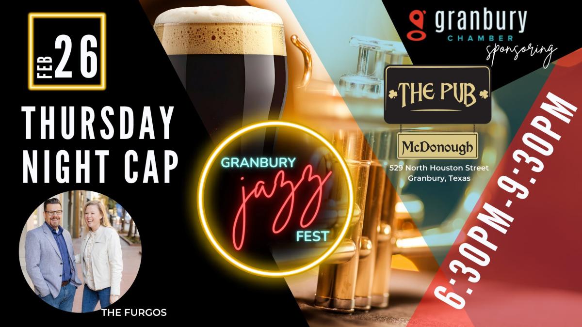 | | Join us for the kick-off to the 2026 Granbury Jazz Fest at our Jazz Night Cap at Pub McDonough! From 6:30-9:30pm, enjoy great food, good company, and live jazz from The Furgos as we kick off the 5th Annual Granbury Jazz Festival. | | | Keep the good times rolling for the music-filled kick-off to the 2026 Granbury Jazz Fest at our Jazz Night Cap at Barons Creek Vineyards Tasting Room with The Burchill Duo! Enjoy live music and wine from 6:30 - 9:30pm. | | | |