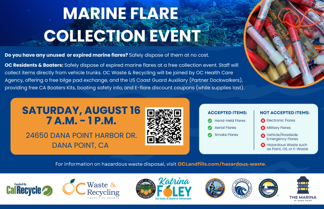Join the CA Expired Marine Flare listserv to get updates on more events happening in November with the following local governments and organizations: City of Oceanside, Alameda County, Del Norte County, Marin County, Napa County, San Francisco County, San Luis Obispo County, Santa Barbara County, Santa Cruz County, Port of San Diego, Port of Los Angeles, and West Contra Costa County.