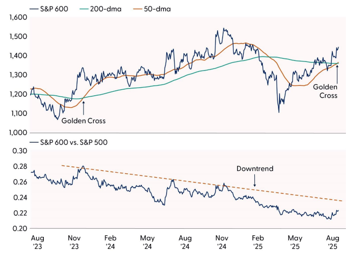 Earnings revisions are not the only thing broadening out. Last month marked an important rotation for the S&P 500 as the record-high rally expanded beyond the borders of big tech. A notable unwind of crowded positioning in highmomentum and high-beta names led to flows pouring into other sectors and down market cap. For the S&P 500, this meant expanding breadth metrics and a new all-time high for the equal-weight S&P 500, a proxy for the “average” large cap stock. For small caps, new buyers emerged that drove the S&P 600 Small Cap Index up roughly 7% in August, marking its best month of outperformance over the S&P 500 in over a year.