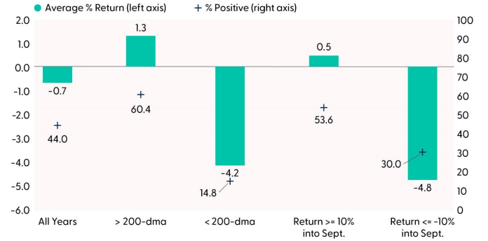 However, context is key when it comes to seasonal data, and right now, the market is trending higher and exhibiting strong momentum into September. When accounting for these factors, September hasn’t been so bad. For example, when the S&P 500 is above its 200-day moving average (dma) going into September, the average price return for the month jumps to 1.3%, with 60% of occurrences producing positive results. This compares to an average September price decline of 4.2% and positivity rate of only 15% when the index is trading below its 200-dma going into the month.