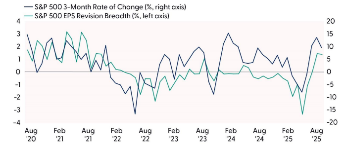 Earnings revision breadth measures the net number of upward EPS estimate revisions minus downward revisions, divided by the total number of index members, for each one-month window. Source: LPL Research, Bloomberg 08/28/25 Disclosures: Past performance is no guarantee of future results. All indexes are unmanaged and can’t be invested in directly.