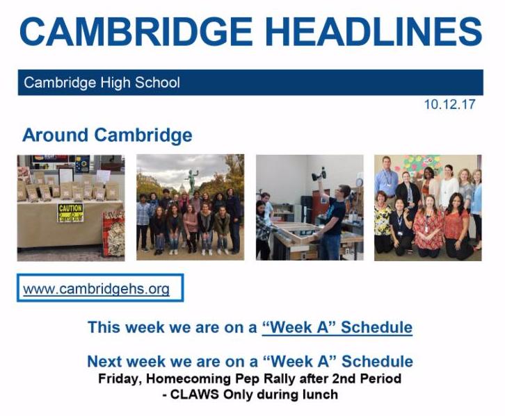 This year, Cambridge is delivering student and staff morning announcements electronically through Cambridge Headlines. Each morning, an email is sent to every student's FCS email address. Also, these announcements are posted to the school's website, www.cambridgehs.org.