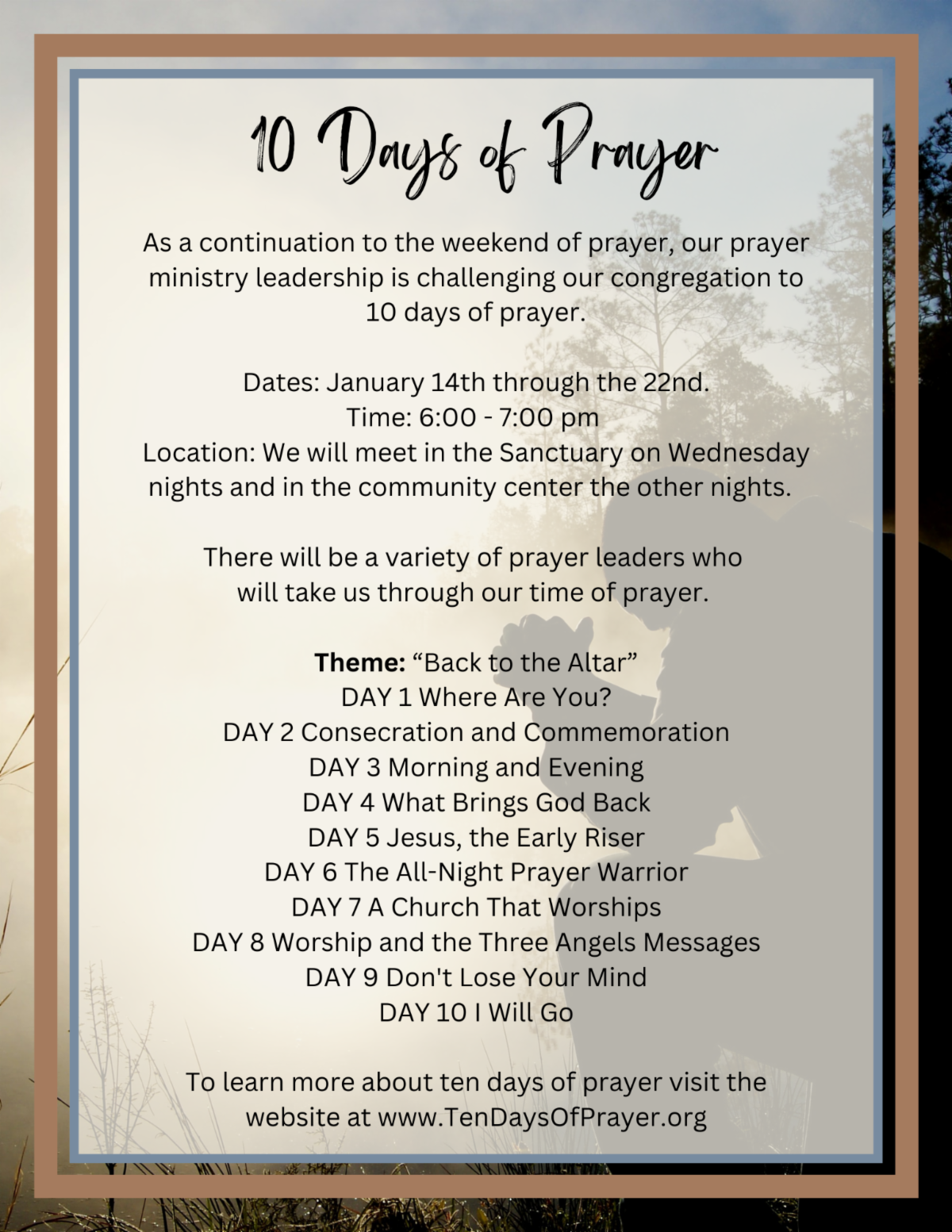 - First two sessions of Ten Days of Prayer from 2:00 - 4:00 pm in the earliteen room: