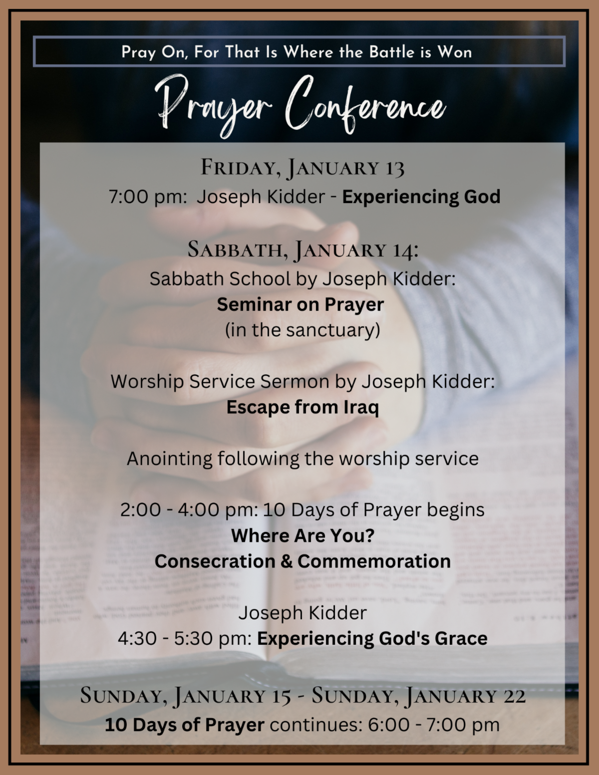 There will be a seminar on prayer by Joseph Kidder in the sanctuary during the Sabbath School time