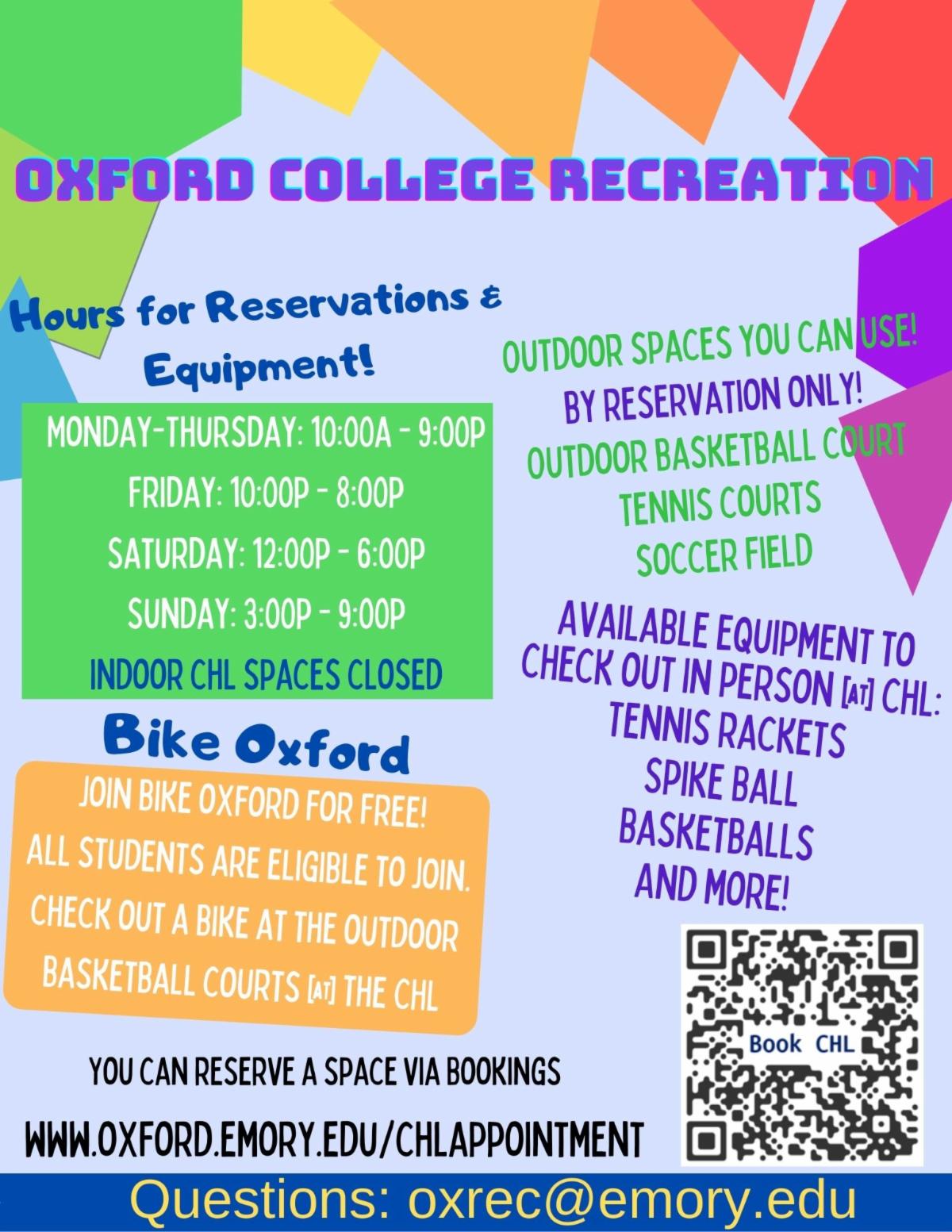 Book an appointment online here.We know this year is different, but we are doing our best to give you options that are safe and follow the Compact guidelines. Questions? Please feel free to reach out to Amanda or our rec services team at oxrec@emory.edu.