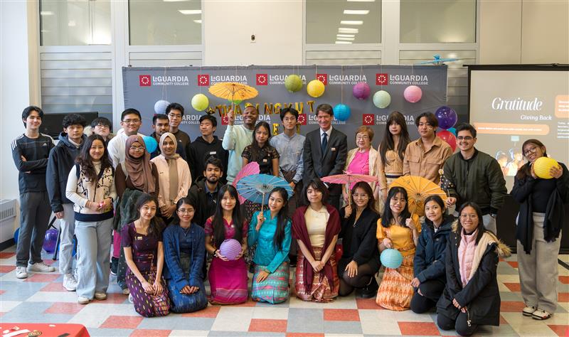 | | The Division of Communications and External Affairs offers various additional resources to help you share news with the campus, including an event calendar, photography, graphic design, and more. | | Tamoy Bloomfield, a Paralegal Studies major, and Jessicah Erondu, a Creative Writing major, have both been accepted to Columbia University’s School of General Studies for Spring 2026. Bloomfield and Erondu, pictured above from left to right, are 2025–26 members of President’s Society. The news broke during the dinner portion of a recent President’s Society evening workshop. Bloomfield shared her Columbia acceptance. Moments later, Erondu announced she had been admitted as well. “The room erupted in cheers; it was an incredible moment,” said Stefania Dinu, Foundation Engagement Specialist for President’s Society. Read more about Bloomfield and Erondu here. | | Myanmar Students Club Celebrates Thadingyut Festival | | On Tuesday afternoon, LaGuardia’s Myanmar Students Club hosted the Thadingyut Festival in the Poolside Café. Also known as the Festival of Lights, the Thadingyut Festival is the club’s largest event of the year. The festival is traditionally celebrated at the end of Vassa, a three-month period of religious retreat for Buddhist monks and nuns. President Kenneth Adams delivered remarks at the celebration, noting that by bringing the celebration to LaGuardia, members of the Myanmar Students Club keep tradition close to their hearts while away from family, and also teach peers about the culture of Myanmar. Attendees also enjoyed complimentary Burmese cuisine and participated in DIY lantern making, as well as painting and games. | | Nutrition and Culinary Students Support Thanksgiving Event at The Boys Club of New York | | |