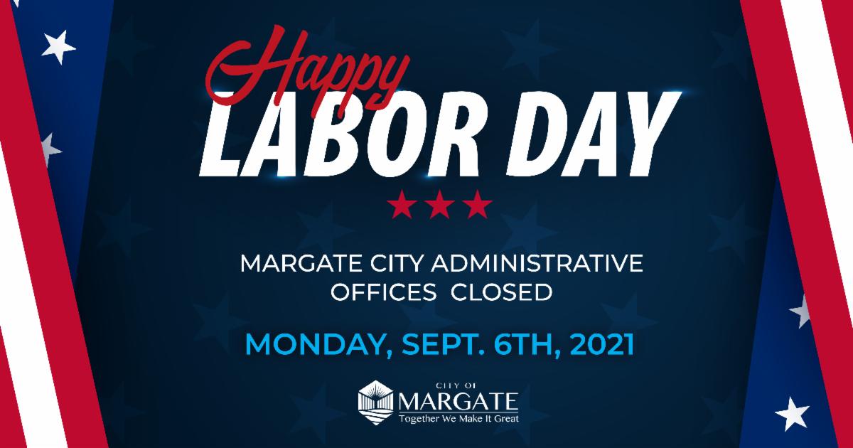 In observance of Labor Day, all City of Margate administrative offices will be closed on Monday, Sept. 6, 2021, including City Hall and the NW Focal Point Senior Center.