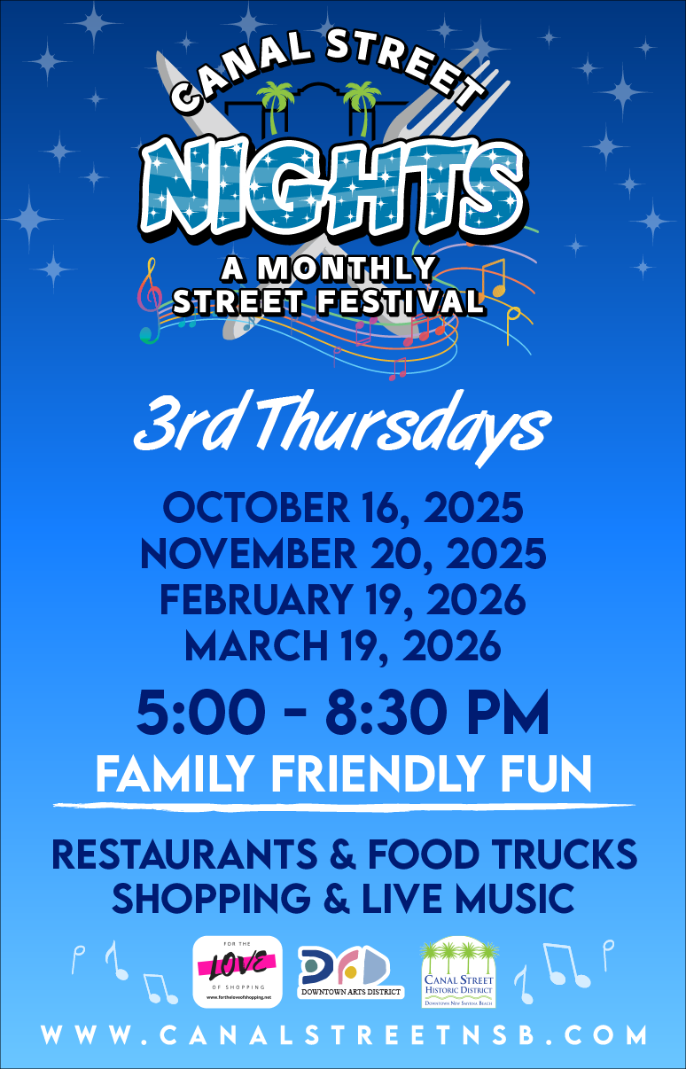 Visit our Downtown Arts District on the 1st Saturday of the month. Stroll down Canal, Douglas, and Magnolia. Enjoy the beautiful galleries and see the amazing art community here in New Smyrna Beach. Please also be sure to stop by the other galleries on Canal Street as you enjoy Gallery Walk.