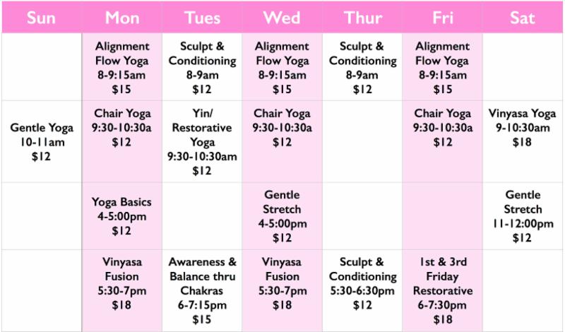 Kathleen Bell, RN will lead 4 classes during sunset. They will be loosely guided. These classes are free and open to all levels of experience.