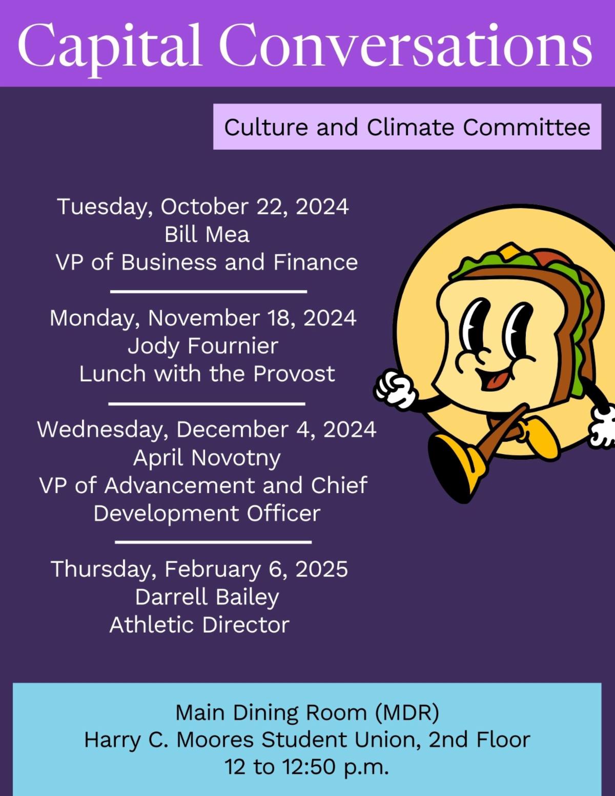 Proudly created by the Culture and Climate Committee, the Capital Conversations series builds upon the success of the Lunch with the Provost, elevating it to a new level of connectivity. Capital Conversations is a lunchtime series open to all faculty and staff. Come join your fellow employees and enjoy lunch on us!