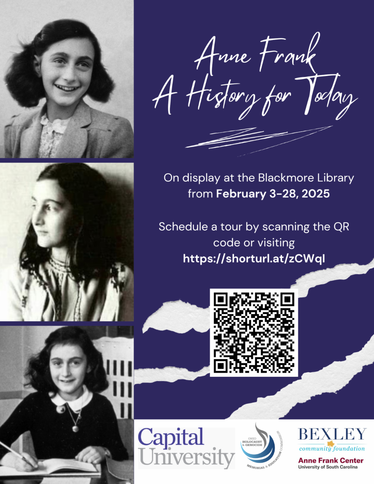 Capital University Library Services and the Department of History proudly present “Anne Frank: A History for Today.” Curated by the Anne Frank Center at the University of South Carolina, the official U.S. partner of the Anne Frank House in Amsterdam, the exhibition tells the story of Anne against the backdrop of the Holocaust and the Second World War. The exhibition aims to inform visitors about the history of the Holocaust from the perspective of Anne and her family; show visitors that differences between people exist in all societies; encourage visitors to analyze the concepts of intolerance, persecution, exclusion, mutual respect, human rights, democracy, and their meaning for us; and convince visitors that the creation of a society in which differences between people are respected is not something automatic.
