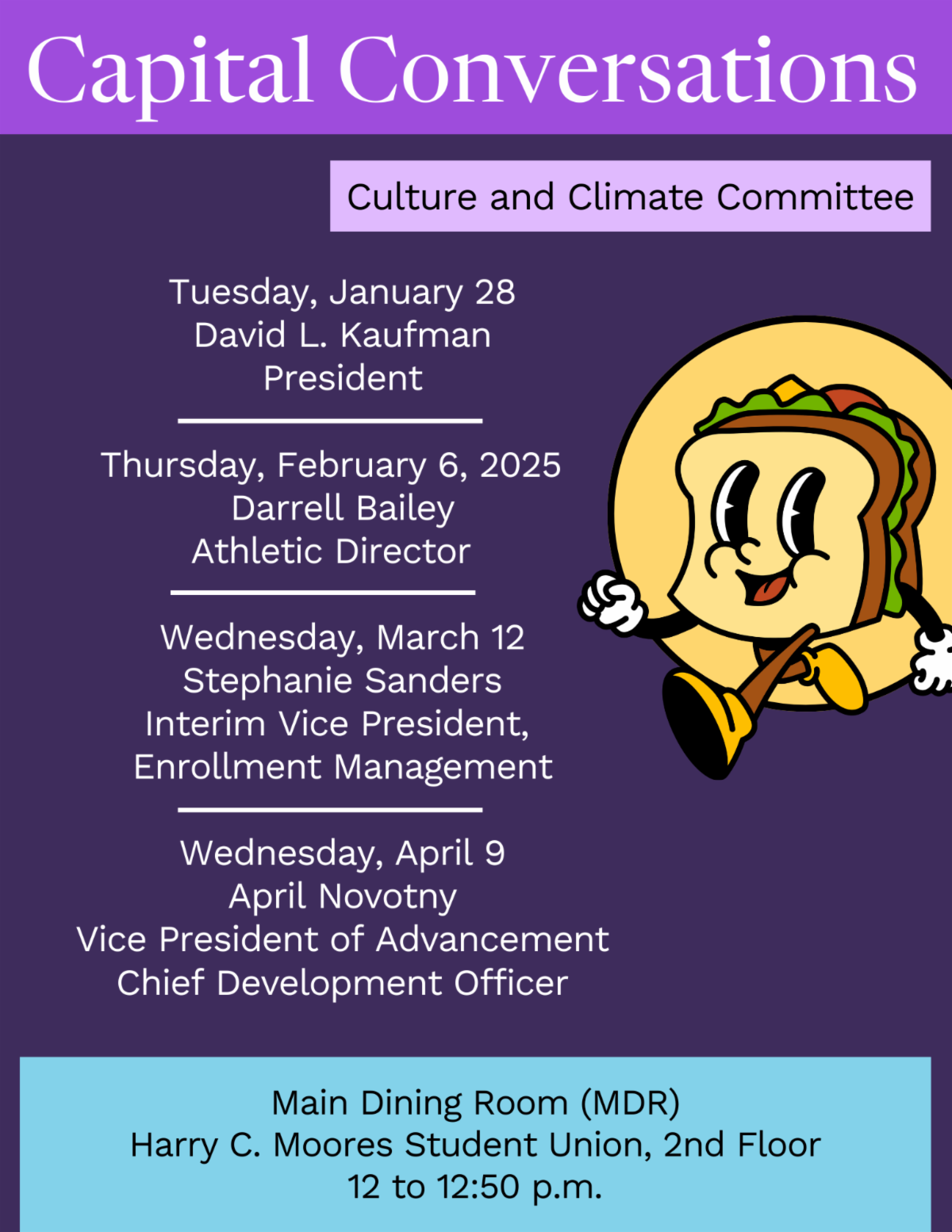 Proudly created by the Culture and Climate Committee, the Capital Conversations series builds upon the success of the Lunch with the Provost, elevating it to a new level of connectivity. Capital Conversations is a lunchtime series open to all faculty and staff. Come join your fellow employees and enjoy lunch on us!