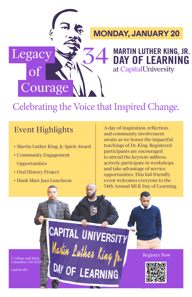 Capital is proud to host the 34th annual Martin Luther King Jr. Day of Learning on Monday, January 20, 2025. This year's theme, "Legacy of Courage: Celebrating the Voice that Inspired Change," invites students, faculty, staff, alumni, and the community to honor Dr. King's work through a day of inspiration, reflection, and community engagement.