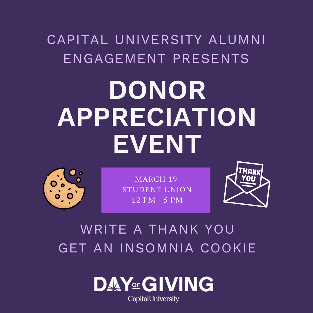 Want an Insomnia cookie? All you have to do is write a thank you note for donors who support our Day of Giving! Donors will be giving to support ALL areas of the university, so no matter your major or year at Cap, your “Thank You” goes a long way! BONUS: Film a thank you video and enter a raffle for Capital and Alumni gear! You don’t want to miss out!