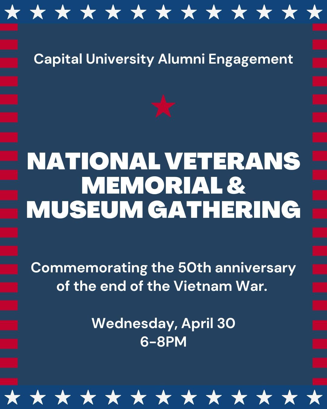 Alumni, faculty, staff, students, and families and friends of the university are welcome to attend this complimentary special event. The evening also includes the Presenting of Colors by Capital University ROTC, a reception, and tours of the National Veterans Memorial and Museum.
