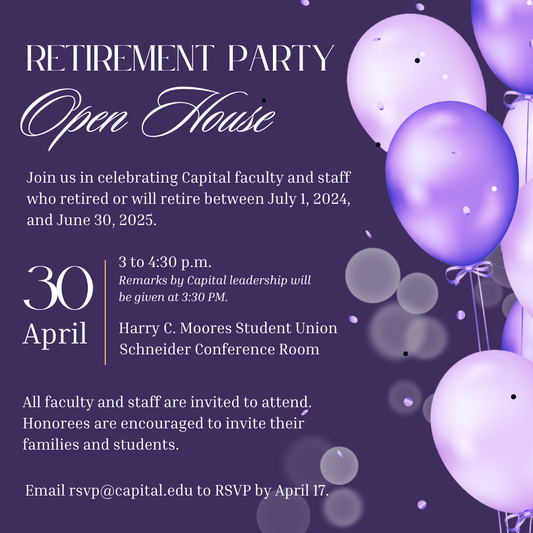 Light refreshments will be served, with remarks by Capital leadership beginning at 3:30 p.m. Honored retirees are invited to attend with their families. Please RSVP at rsvp@capital.edu by Thursday, April 17.