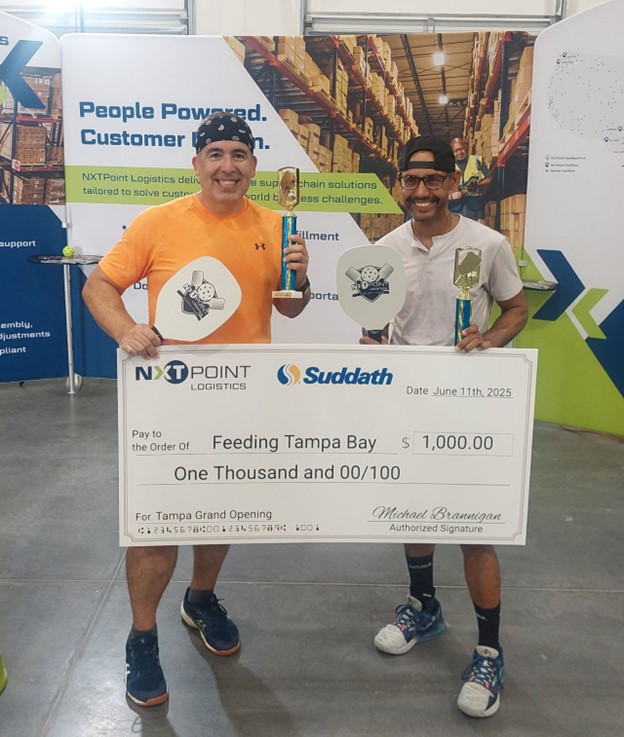 What a day for the CareerSource Tampa Bay team! Our very own Andres and Jesse represented us at the pickleball tournament during the grand opening of the new NXTPoint Logistics & Suddath Tampa warehouse. After five hard-fought games, they emerged as champions among 16 competing teams! As part of our win, a $1,000 donation was made in our name to Feeding Tampa Bay, supporting their vital work in our community. Congratulations, Jesse and Andres!