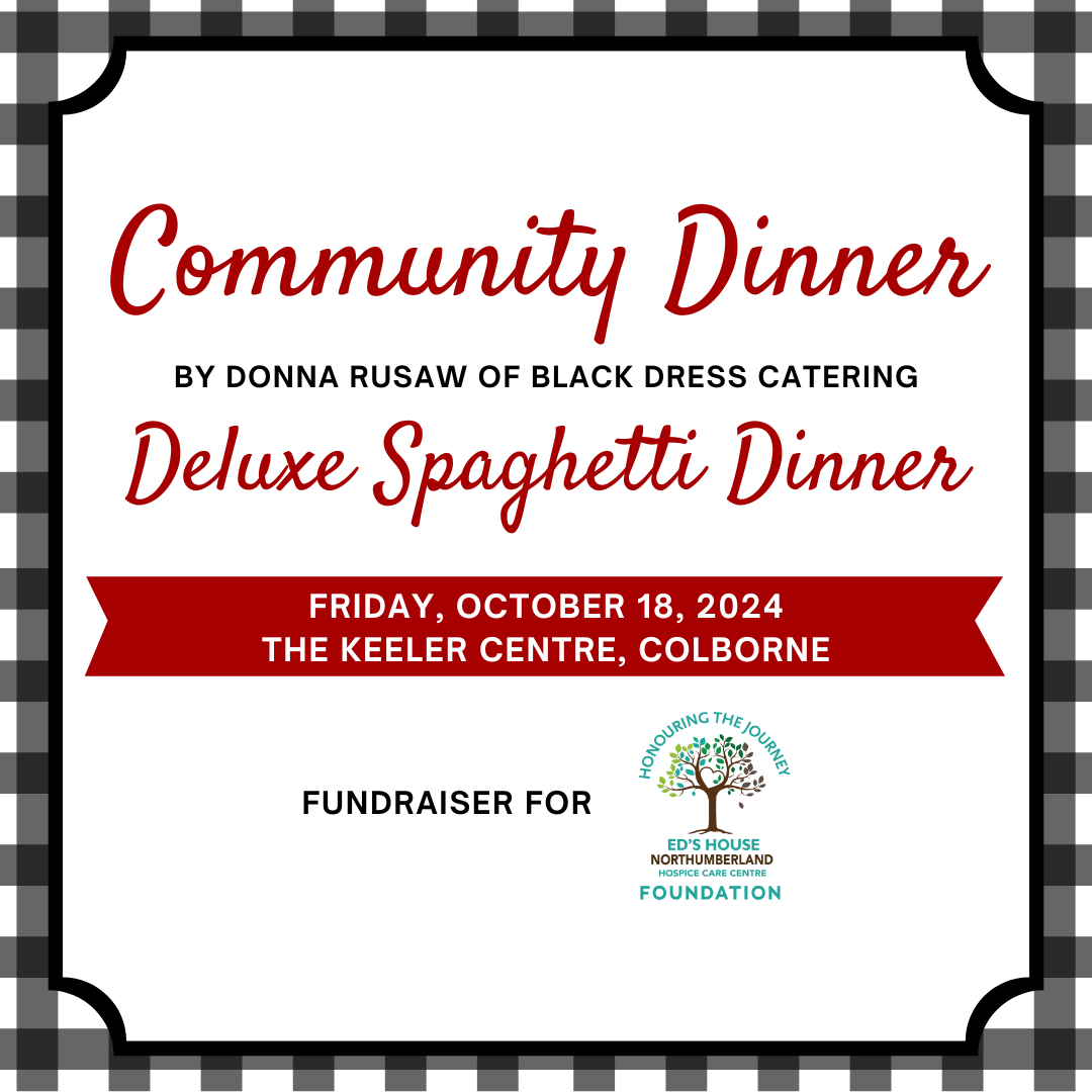Mark your calendars for a Deluxe Spaghetti Community Dinner hosted by Donna Rusaw of Black Dress Catering on Friday, October 18 at the Keeler Centre in Colborne!