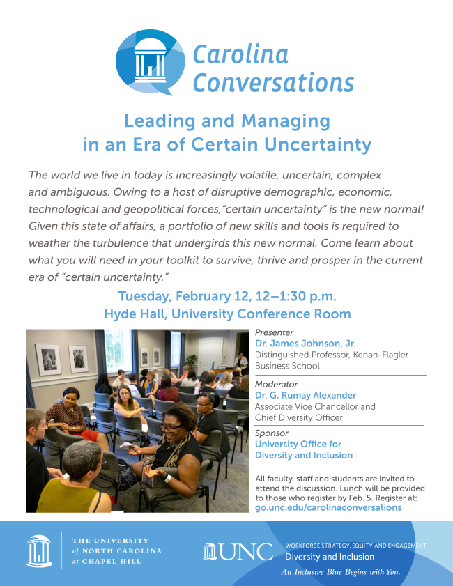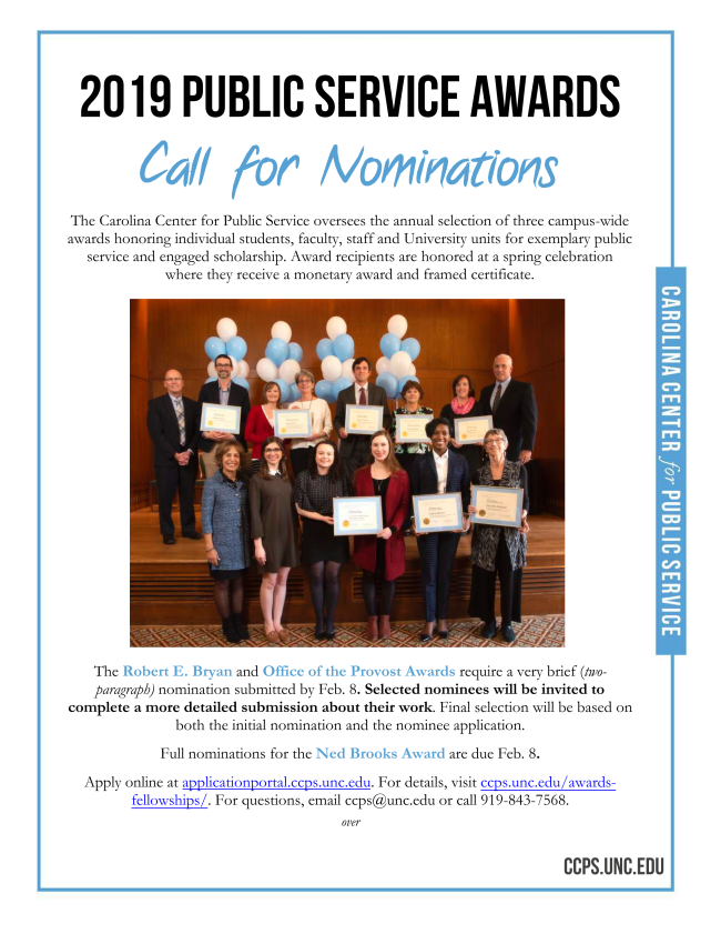 annual Diversity Awards are now being accepted, beginning Feb. 4. The purpose of the awards is to recognize members of our UNC community who have given their time and effort to further diversity and inclusion efforts at Carolina and in our surrounding community. The awards will be presented at a ceremony this spring.