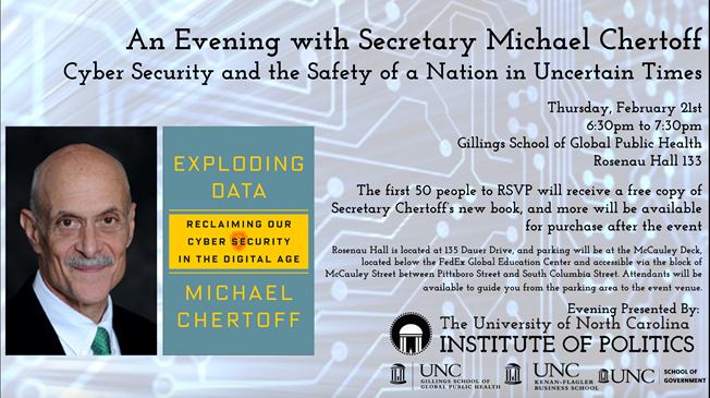 On behalf of the UNC Institute of Politics, the UNC Gillings School of Global Public Health, the UNC Kenan-Flagler Business School, and the UNC School of Government, you are invited to “An Evening with Michael Chertoff.” The event will be Thursday, February 21st, at 6:30pm in Rosenau Hall 133 at UNC Chapel Hill.