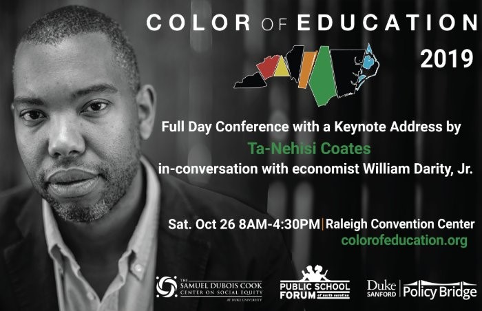 Award-winning author Ta-Nehisi Coates will headline Color of Education 2019 as part of his official book tour for his forthcoming novel “The Water Dancer” slated for release on September 24. In addition to a reading from his novel and a Q&A session with the audience, Coates will be joined on stage for an in-conversation with Dr. William “Sandy” Darity, Samuel DuBois Cook Professor of Public Policy at Duke University, about race in America.