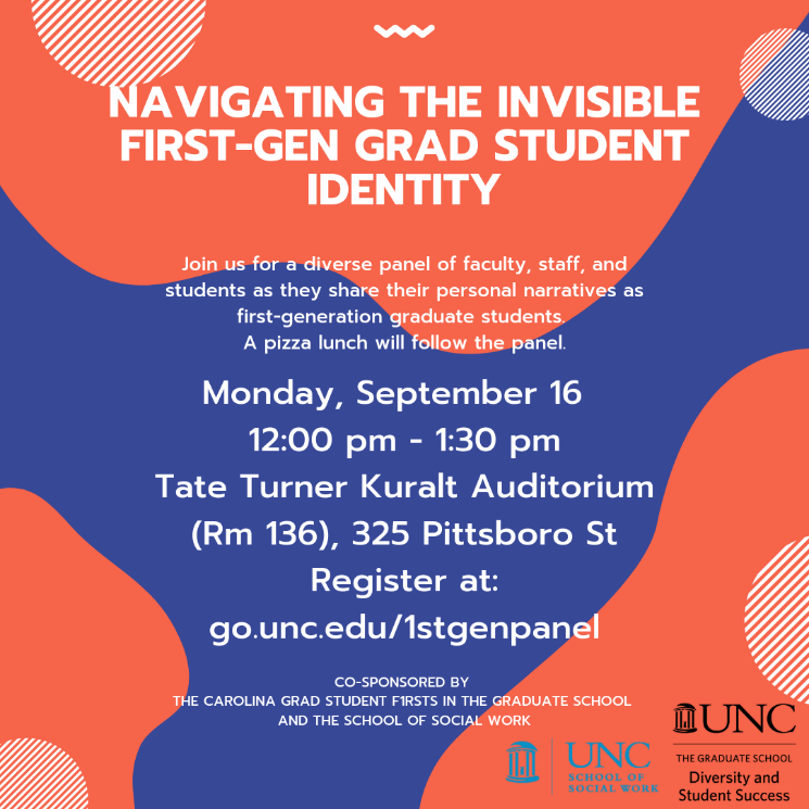 Are you the first in your family to pursue a graduate degree? How do you navigate the academy? Do others feel the same way as me? What does it look like to succeed as a first-generation graduate student? Join us for a diverse panel of faculty, staff, and students as they share their personal narratives as first-generation graduate students. Come prepared to engage with the panel in meaningful discussion. Lunch will be served immediately following the panel for continued conversation. Co-sponsored by the Carolina Grad Student F1RSTS (Diversity & Student Success in The Graduate School) and the School of Social Work.