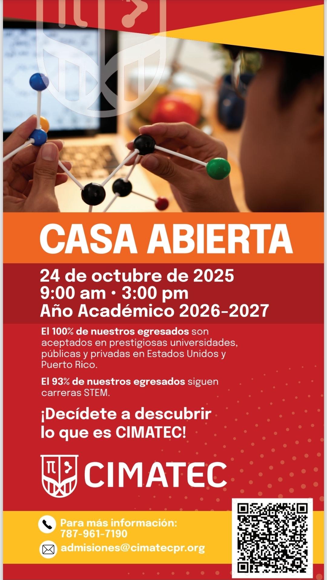 La Escuela Especializada en Ciencias, Matemáticas y Tecnología (CIMATEC) invita a padres, tutores y estudiantes de otras escuelas a su Casa Abierta, el viernes, 24 de octubre de 2025, de 9:00 a.m. a 3:00 p.m. Será una experiencia educativa única en la que los visitantes podrán conocer las modernas instalaciones del plantel, dialogar con el personal docente y descubrir las oportunidades académicas que distinguen a CIMATEC.