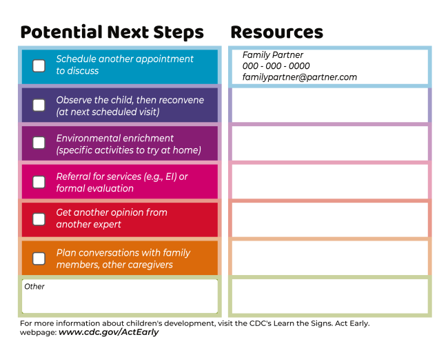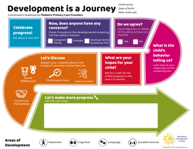 Conversations about developmental screening results and concerns can be time-consuming and anxiety-provoking for families and pediatric primary care providers, early educators, and home visitors.