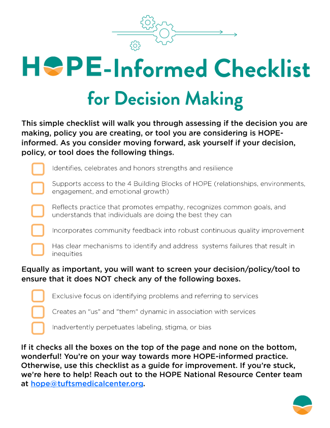 This simple checklist will walk you through assessing if the decision you are making, policy you are creating, or tool you are considering is HOPE-informed. As you consider moving forward, ask yourself if your decision, policy, or tool accomplishes the things listed in the checklist.
