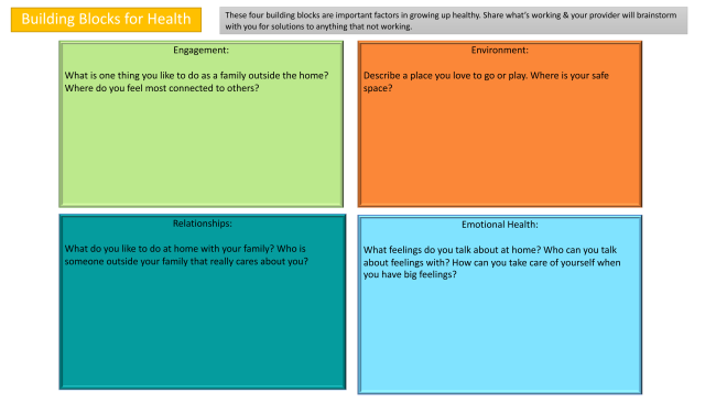 These four building blocks are important factors in growing up healthy. Share what’s working & your provider will brainstorm with you for solutions to anything that not working.