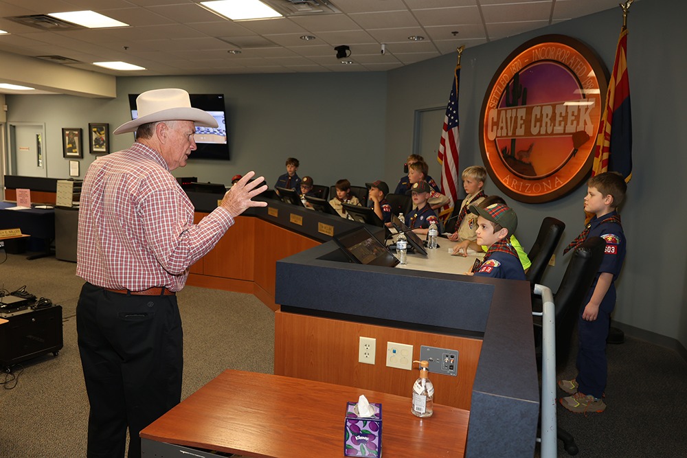On Monday, April 7, Cave Creek’s Mayor Bob Morris gave a civics lesson to the Webelos Den Pack 603 about how a town council operates. He also shared his experiences as an Eagle Scout. Pack 603 consists of students from kindergarten through 5th grade students.