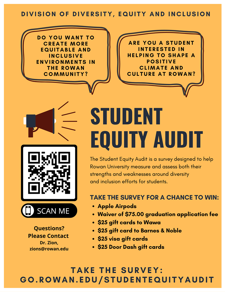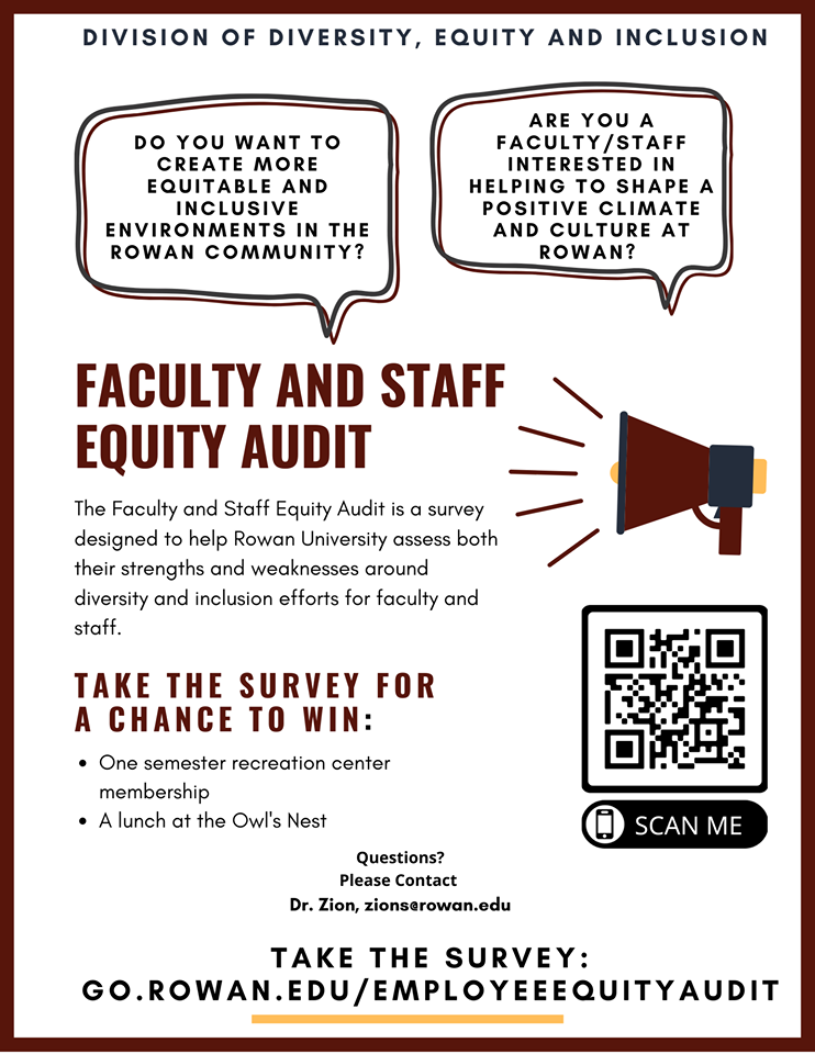 The Division of Diversity, Equity, and Inclusion invites you to take the Equity Audit survey to help Rowan University assess both their strengths and weakness around diversity and inclusion efforts.
