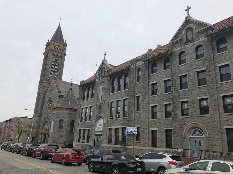 Photo: St. Francis Xavier Roman Catholic Church/Former St. Paul's Roman Catholic Church (1902; Thomas C. Kennedy, architect) and school (1927; John Stack, builder), 1501 E. Oliver Street, Baltimore, MD 21213. Public domain photograph by Eli Pousson, 2019 February 14.