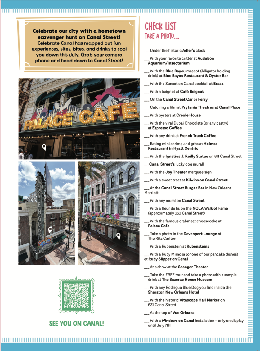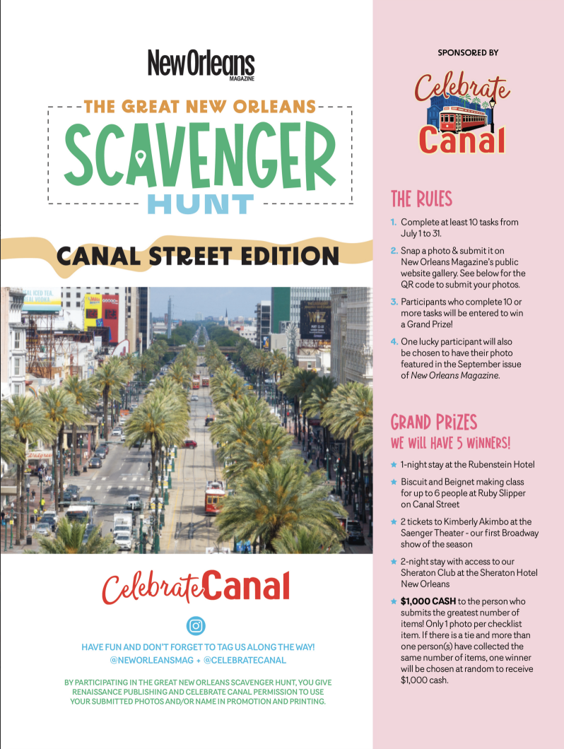 Celebrate Canal! is proud to be part of New Orleans Magazine’s July Scavenger Hunt. Explore Canal Street, complete fun tasks, and submit photos for a chance to win prizes—including a cash award for the top participant!