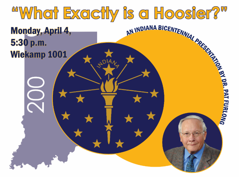 Please join us for a lively conversation on the origins of the state nickname, with Professor Emeritus of History Dr. Pat Furlong, on Monday, April 4, 5:30 p.m. in Wiekamp Hall, room 1001. This presentation is part of the Next Indiana Bookshelf grant the library received from the Indiana Humanities Council in celebration of the state's bicentennial and is free and open to the public.