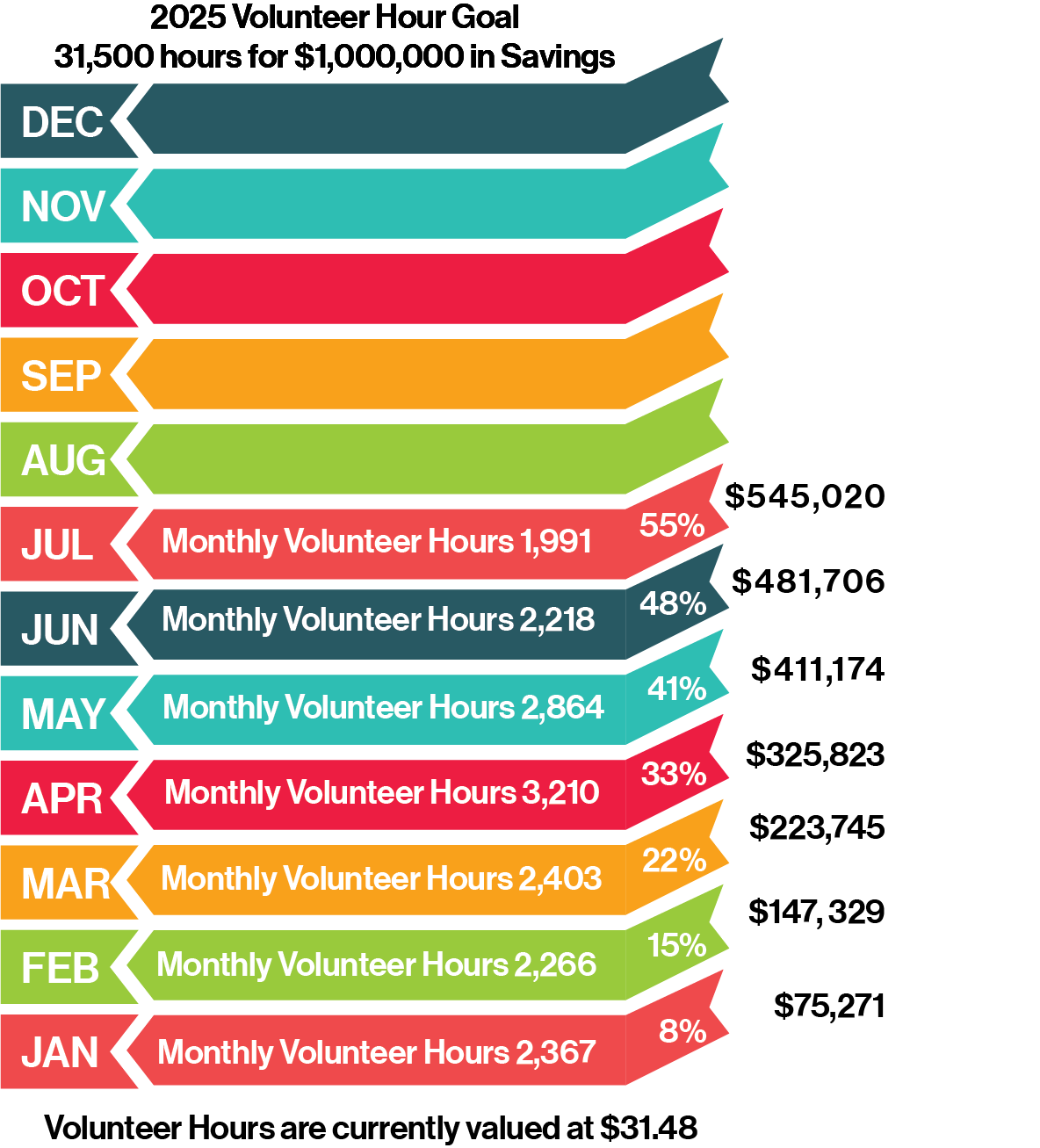 Thank you to all the volunteers on the construction site, in the ReStore, in the office, or serving on the board or a committee. We are well on track to meet our 2025 goal! Your volunteer hours make a profound difference in the Sandhills. You help raise the money needed to purchase building materials and some of the swing hammers used to build the homes.