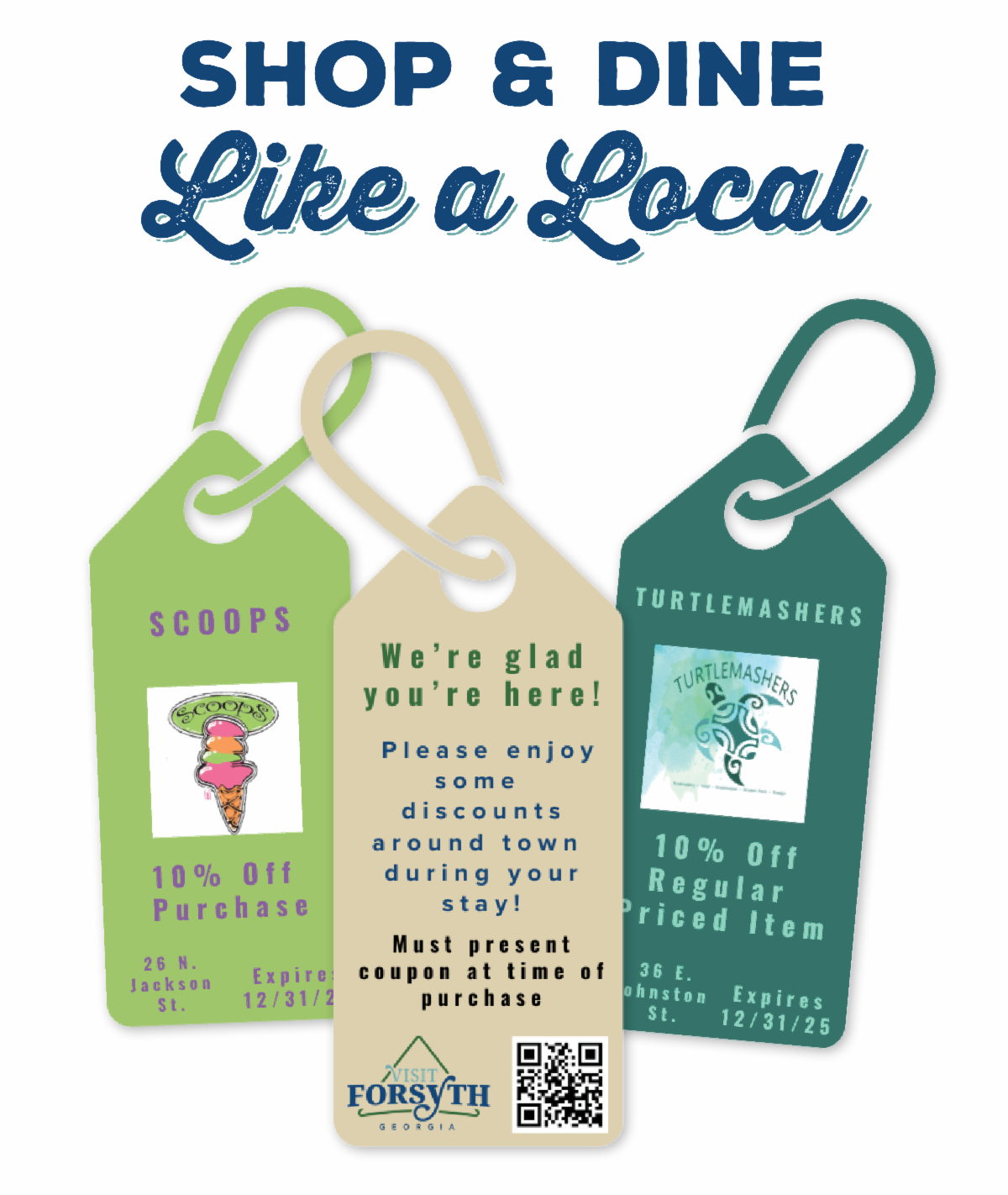 Our new Shop & Dine Like A Local coupons are available at the Welcome Center, 48 North Jackson Street. Visit the historic downtown and support local. Forsyth has several unique shopping experiences, local artisans, and delicious international cuisines. There is even a coupon for Grits Café’s award-winning Grits Fritters!