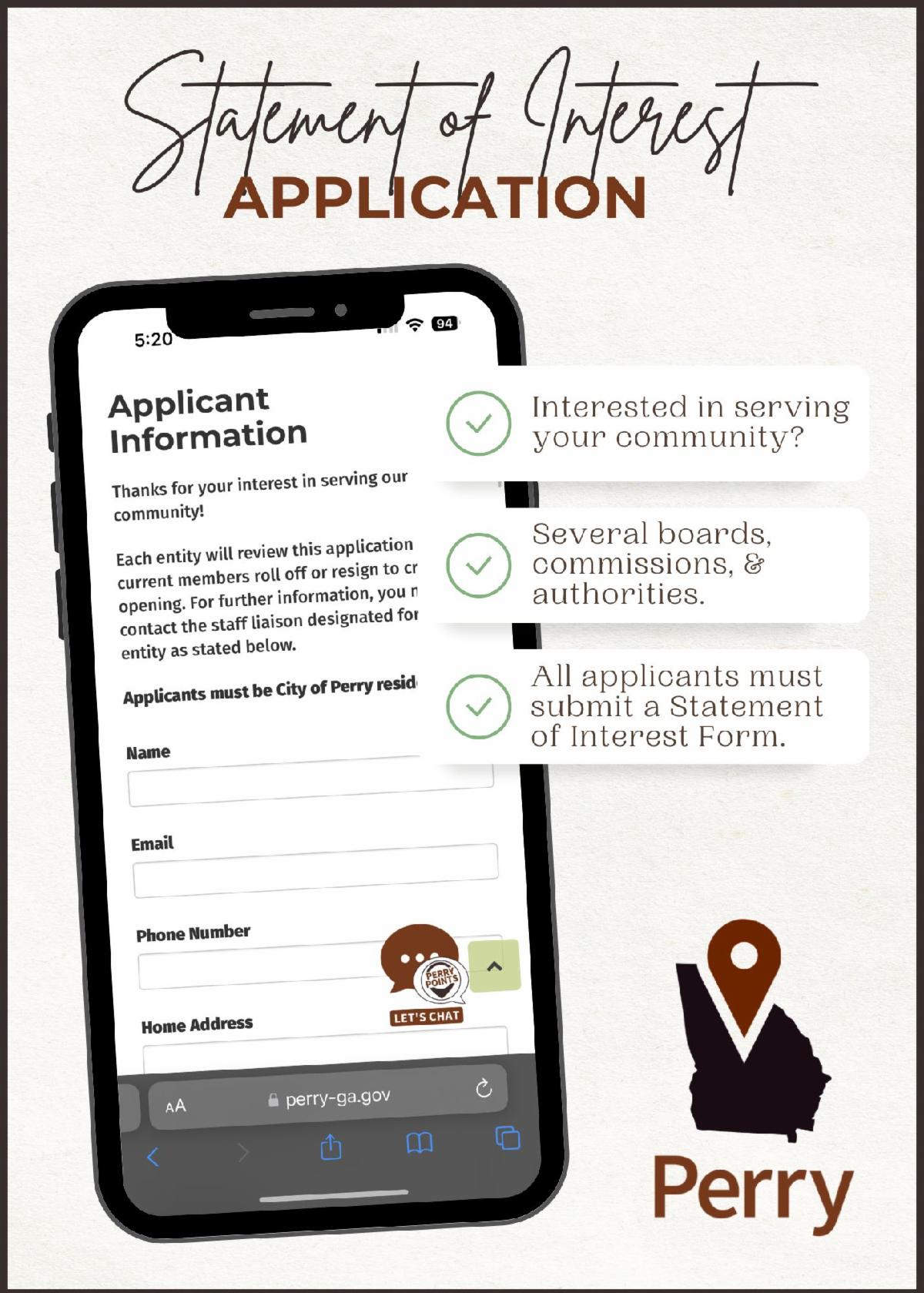 As part of our commitment to encouraging civic participation and fresh ideas, the City of Perry invites interested citizens to submit a Statement of Interest for upcoming elected positions. If you’re looking for a meaningful way to engage in your community, you can submit a Statement of Interest form for consideration.