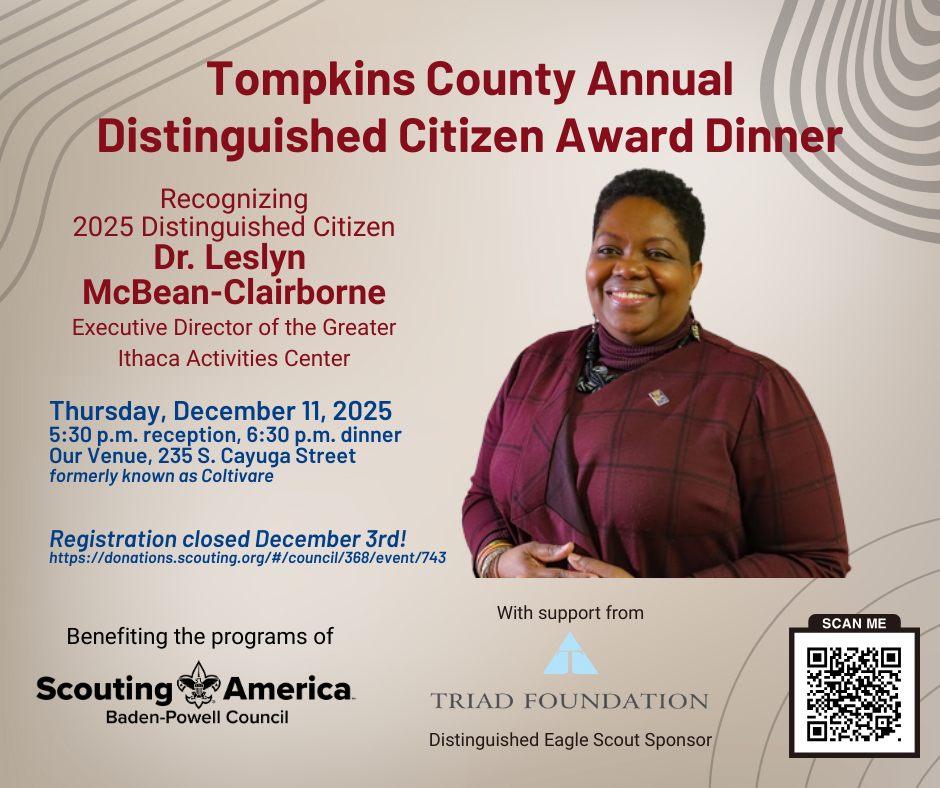 The award honors individuals who embody the core Scouting principles of integrity, respect, service, and good citizenship in their everyday life and community work. Dr. McBean-Clairborne is a transformational leader whose decades of service have shaped Tompkins County’s commitment to equity, inclusion, and community well-being. A respected mediator, facilitator, certified mediation skills trainer, and community organizer, she has built her life’s work around the belief that meaningful change requires active participation, courageous conversations, and unwavering advocacy.
