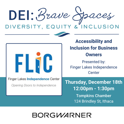 The Tompkins Chamber is proud to host a DEI: Brave Space session, "Accessibility and Inclusion for Business Owners" presented by the Finger Lakes Independence Center
